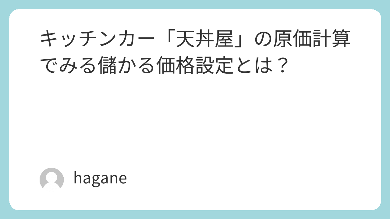 「天丼屋以外の『原価率』の目安も知りたい」 「『原価率』を下げる、かんたんなテクニックはないの?」 プロが実践(じっせん)する「原価計算」と「利益設計」のキホンを、セミナー資料から抜粋してまとめた【儲かるキッチンカー開業 限定ガイドブック】を今だけ無料でプレゼント中です。